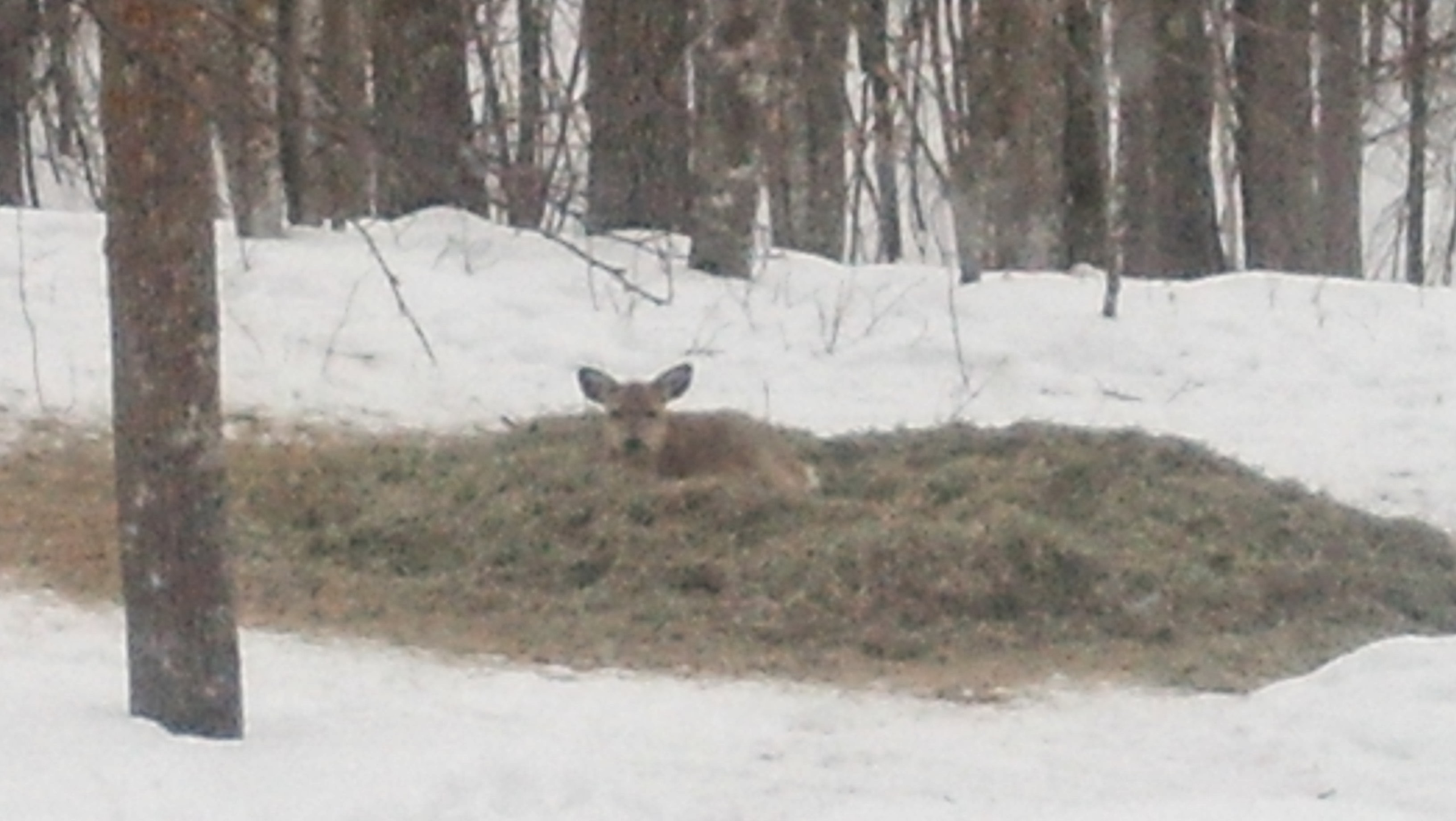 Not only does this spread-out alfalfa bale provide food, the heat it continues to generate has melted the snow from underneath by over a foot. This little doe happily munched and dozed until the others found her out.